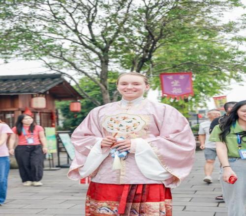 一颦一笑皆风景,莱巴金娜身穿汉服漫步宁波走马塘村