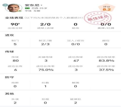 此役安东尼首发并踢满全场90分钟,5次射门2次射正,在预期进球数只有0.37的情况下打入两粒进球,其中包括一粒绝平进球。79次传球66次成功,成功率83.5%,送出3次关键传球,此外防守端还贡献了1次拦截。赛后评分全场最高。