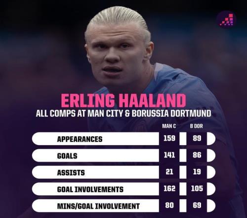 哈兰德在曼城和多特蒙德都保持非常高的进球效率。据数据机构Opta统计,哈兰德总共为多特蒙德出场89次,打进86球,还送出19次助攻,直接参与105球,每69分钟造一球。