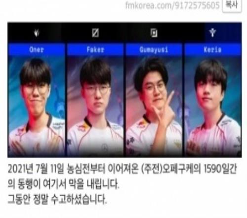 体育资讯11月17日称 今日T1官宣Gumayusi正式离队,而韩网有网友发帖自从2021年7月11号开始,OFGK组合已经一起走过了1590天。
