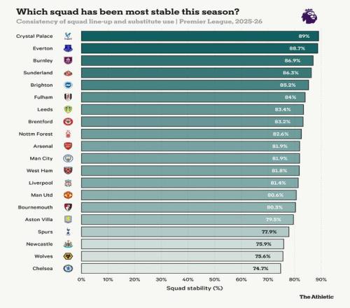 近日,The Athletic发表了专题文章,深度分析了英超球队在密集赛程下的阵容管理策略,通过独创的“阵容稳定性评分”量化各队的轮换程度,并聚焦水晶宫与切尔西这两个截然相反的案例,揭示了阵容稳定与否与球队成绩之间复杂而微妙的关系。