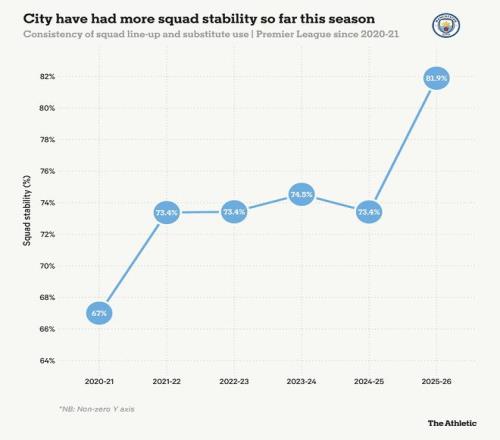 格拉斯纳的同行、曼城主帅佩普-瓜迪奥拉通常以喜欢调整阵容而闻名,但本赛季他已显著偏离了他惯常的轮换政策。瓜迪奥拉已经有四次派出了完全相同的首发十一人。作为对比,这在16场比赛中的次数,比之前三个完整赛季(114场英超比赛)加起来还要多。