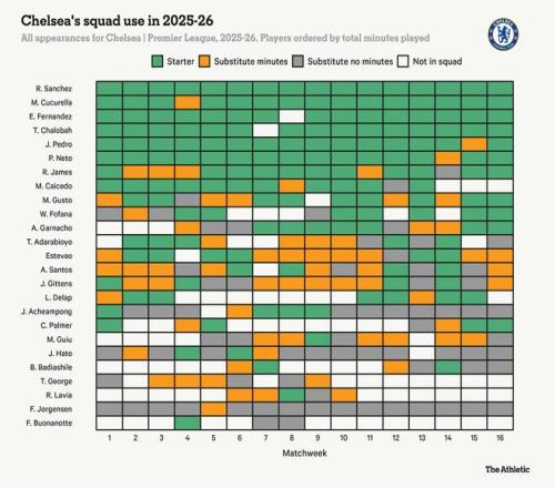 这位意大利教练在联赛中已使用了25名球员,没有哪家顶级俱乐部比他做出的47次首发阵容调整更多。队内只有门将罗伯特-桑切斯踢满了全部16场比赛,下面瞥一眼切尔西的阵容使用情况,就会看出他们的出场时间份额分布……更多样一些。