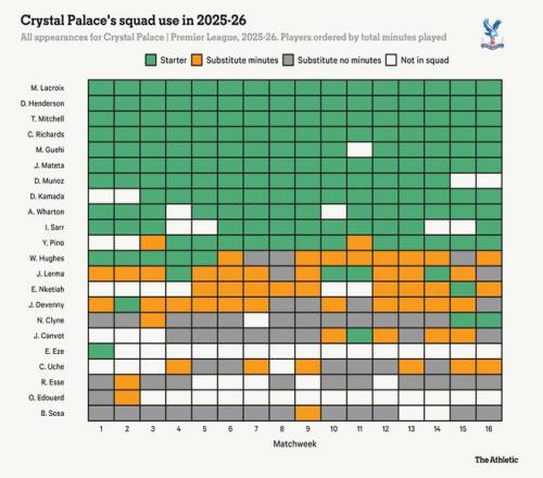 本赛季,水晶宫就是如此。尽管多线作战,格拉斯纳仍倾向于保持一套稳定的阵容——以至于他们因参加欧协联,对阵阿森纳的联赛杯四分之一决赛不得不推迟到下周。