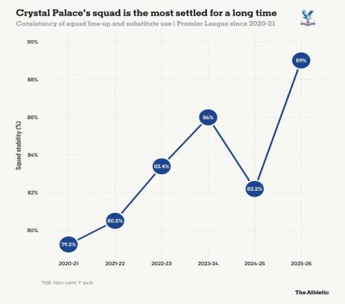 追溯水晶宫过去五个完整赛季的阵容稳定性评分,格拉斯纳在球队坚持使用稳定阵容的做法显得更为突出。尽管在经历了前四年的稳步上升后,2024-25赛季的稳定性出现了显著下降,但本赛季带来了自2018-19赛季以来英超任何球队中最稳定的阵容使用。