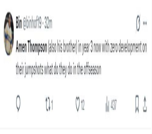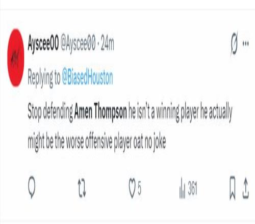 火蜜:阿门-汤普森在进攻方面太没用了。他完全破坏了球的运转节奏,因为他在球场上的任何位置都不具备威胁性,只有在篮下才有威胁。