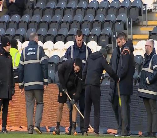 赫尔城工作人员用喷灯为球场除冰,防止比赛延期未果